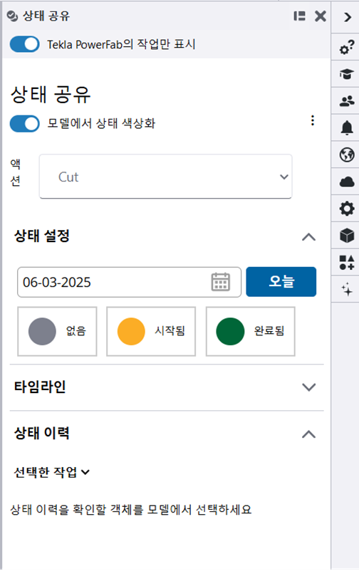 상태 공유에는 제조업자 상태를 빠르게 표시하는 Tekla PowerFab의 작업만 표시 스위치가 있습니다.