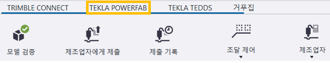 리본에 Tekla PowerFab 탭이 새로 생겼으며, 엔드 투 엔드 협업 워크플로를 위한 도구가 포함되었습니다. 이러한 도구는 프로젝트 팀이 동일한 정보를 활용하여 협업할 수 있도록 지원합니다.