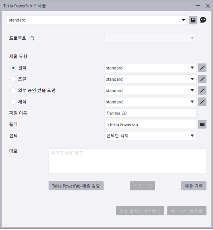 프로젝트의 어느 단계에서든 다양한 유형의 패키지를 제조업자에게 내보내고 제출할 때 제출 도구에서 안내 받을 수 있습니다. Tekla Structures에서 다음 데이터를 로컬로 내보내 확인하거나, 견적, 자재 주문 및 제작을 위해 직접 Tekla PowerFab로 내보낼 수 있습니다.