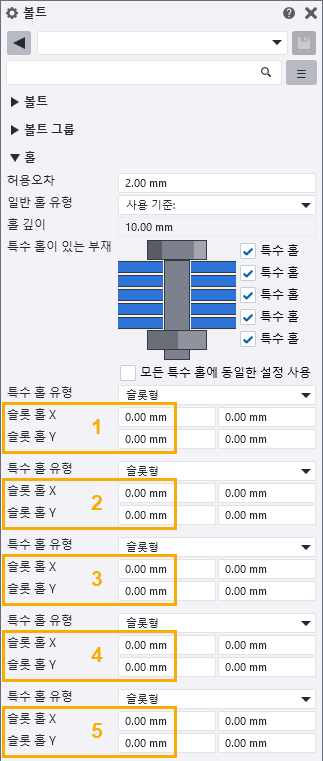 예를 들어, SPECIAL_HOLE_1_X는 볼트 헤드에 가장 가까운 첫 번째 슬롯 부재에서 볼트 그룹의 x 방향으로 슬롯 홀의 허용 치수를 표시합니다. SPECIAL_HOLE_5_Y는 다섯 번째 슬롯 부재에서 y 방향으로 허용 수치를 표시합니다.