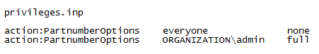 privileges.inp 파일의 PartnumbersOptions을 사용하여 넘버링 속성에 대한 사용자의 접근을 제한하고 무단 사용자가 넘버링 설정을 수정하는 것을 방지합니다.