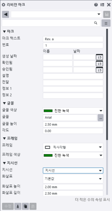 리비전 마크 속성을 수정하려면 도면에서 리비전 마크를 두 번 클릭하고 속성을 변경한 다음 수정을 클릭합니다.