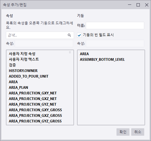 일괄 편집기에서 대상 어셈블리 또는 콘크리트 부재의 목록과 속성 열을 구성할 수 있습니다. 속성 열을 추가, 편집 또는 제거하여 대상 어셈블리 또는 콘크리트 부재에 대해 필요한 속성을 표시합니다.