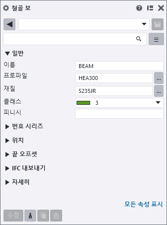 Tekla Structures는 속성 창(측면 창)에 여러 모델 객체 및 도면 객체의 속성을 표시합니다.