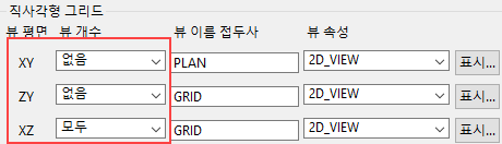 선택 그리드선 뷰 생성 대화 상자에서 뷰 평면 XZ에는 모두를, 뷰 평면 XY 및 ZY에는 없음을 선택합니다. 뷰 이름 접두사와 뷰 속성에 기본 설정을 사용합니다.