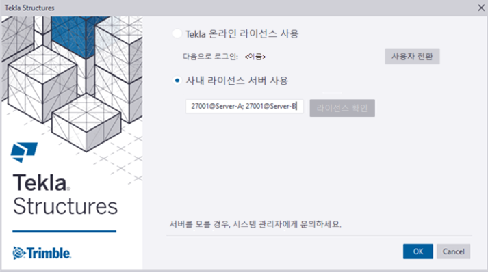 기본적으로 컴퓨터에서 처음 Tekla Structures를 시작할 때 시스템에서 기존 온프레미스 Tekla 라이선스 서버의 주소를 묻습니다. 사용자가 주소를 수동으로 정의할 필요가 없도록 사용자 지정 초기화 파일에서 주소를 미리 정의할 수 있습니다.