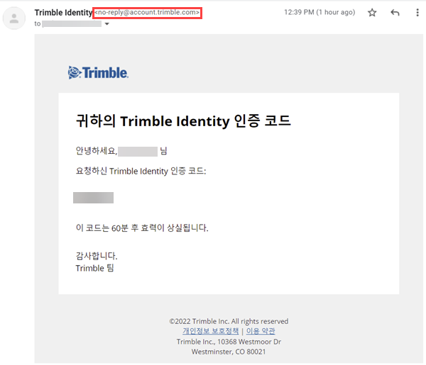 IT 부서에 연락하여 *@account.trimble.com의 이메일을 허용하도록 요청하십시오. 또한 Trimble Identity에서 메일 발송에 사용하는 다음 소스 IP 주소도 허용해 달라고 요청하십시오. 104.130.122.50.