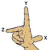 De rechterhandregel geeft de richting van de coördinaatassen aan. Als u de duim, wijsvinger en middelvinger van uw rechterhand zo houdt dat ze drie rechte hoeken vormen, komt de richting van de duim overeen met de x-as, de wijsvinger met de y-as en de middelvinger met de z-as.