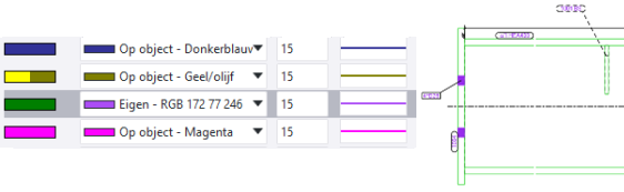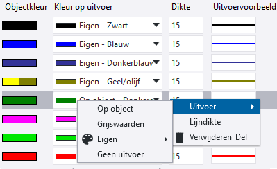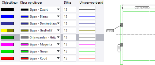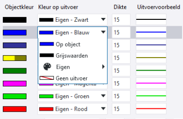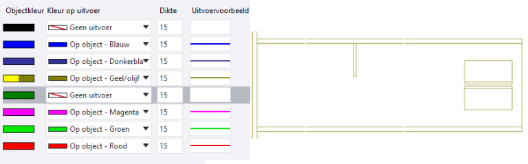 . Hiermee worden alle objectkleuren die in de voorbeeldtekening voorkomen als nieuwe lijneigenschappen toegevoegd aan het tabblad Lijn eigenschappen. Als een kleur al bestaat, dan wordt deze niet nogmaals toegevoegd. Zorg ervoor dat Kleur op uitvoer voor elke rij is ingesteld op Op object. De lijndikte uit de rij Standaard wordt voor alle rijen gebruikt, maar u kunt de lijndikte aanpassen.