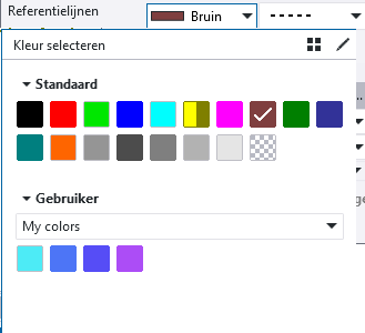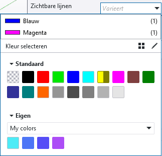 Er wordt een nieuwe rij met een lijneigenschap met de opgegeven kleur toegevoegd aan het tabblad Lijn eigenschappen. De lijndikte komt uit de rij Standaard, maar u kunt die aanpassen. Als de kleur al bestaat, wordt deze niet toegevoegd.