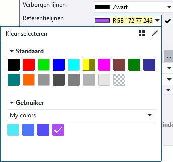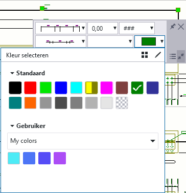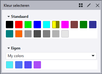 Als u een aangepaste kleur aan een tekeningobject wilt toewijzen, klik dan op een kleurinstelling in een eigenschappenpaneel van een tekeningobject of de selectieknop