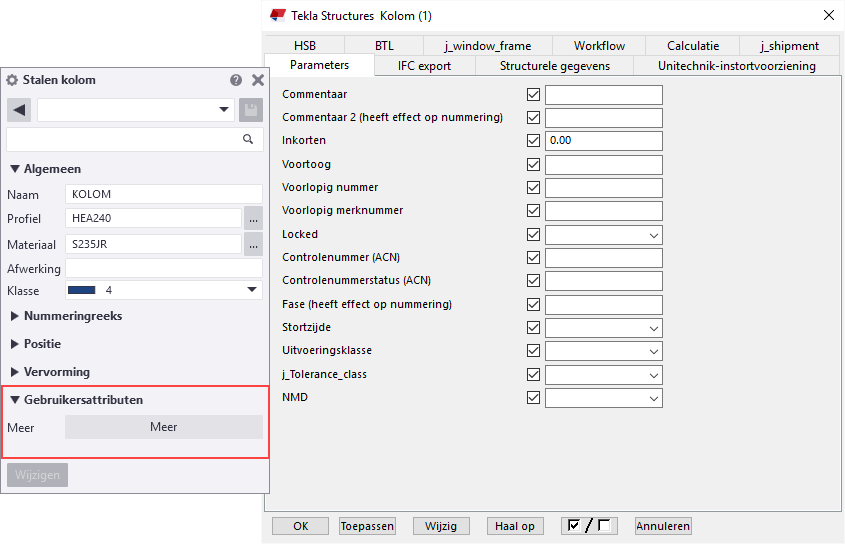 Het eigenschappenvenster en veel dialoogvensters bevatten gebruikersattributen (UDA's) voor verschillende objecten waaronder liggers, kolommen, bouten en tekeningen. Tekla Structures toont deze velden als u op de knop Meer in het eigenschappenvenster of op de knop Gebruikersattributen in een dialoogvenster klikt.