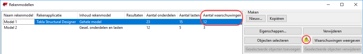 Als er zich problemen in het maken van een rekenmodel waren, geeft Tekla Structures een waarschuwingssymbool in het Rekenmodellen dialoogvenster wanneer u het rekenmodel selecteert.