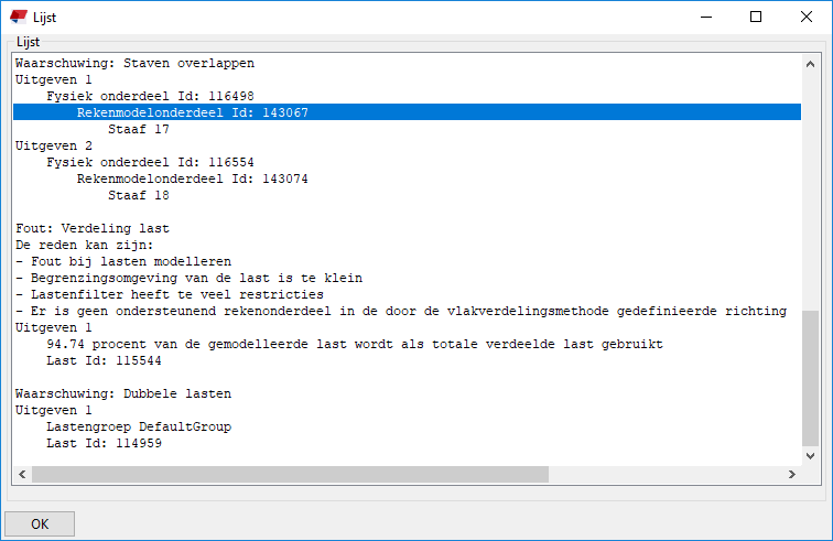 Tekla Structures geeft een gedetailleerde lijst weer met waarschuwingen en fouten. Bijvoorbeeld: