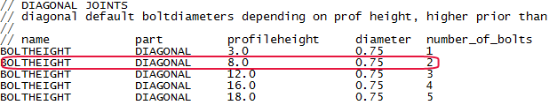 In hoekstaalverbindingen bevinden de standaardeigenschappen voor bouten en de onderdelen zich bijvoorbeeld in de rijen die beginnen met ANGLECLBOLTPART in het gedeelte CLIP ANGLE van het bestand joints.def.