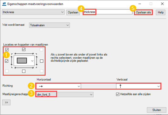In het dialoogvenster Eigenschappen maatvoeringsvoorwaarden kunt u definiëren wat moet worden bemaat, waar en hoe de maatlijnen moeten worden geplaatst en welke maatlijneigenschappen moeten worden gebruikt.
