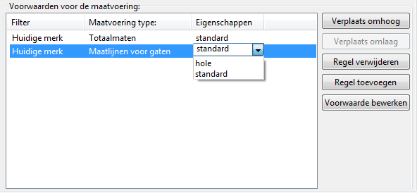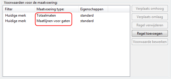 De volgorde van de voorwaarden in de lijst bepaalt de volgorde van de maatlijnen in de tekening: De maatlijnen die door de eerste voorwaarde wordt gemaakt, wordt het dichtst bij het bemate onderdeel geplaatst.