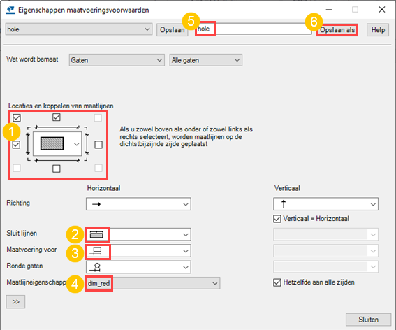 U maakt als volgt maatvoeringsvoorwaarden voor maatlijnen voor gaten: