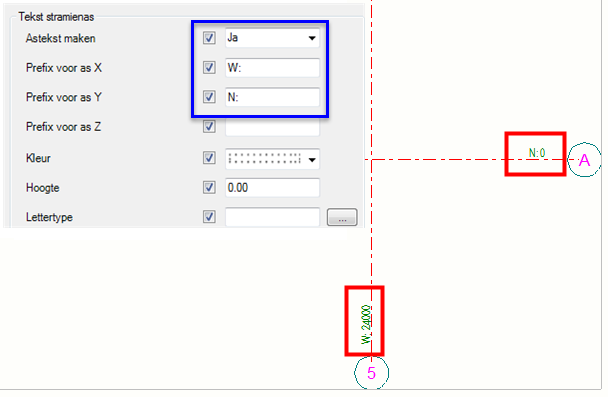 Modelstramiencoördinaten en prefix als tekst op de stramienas in een tekening gebruiken