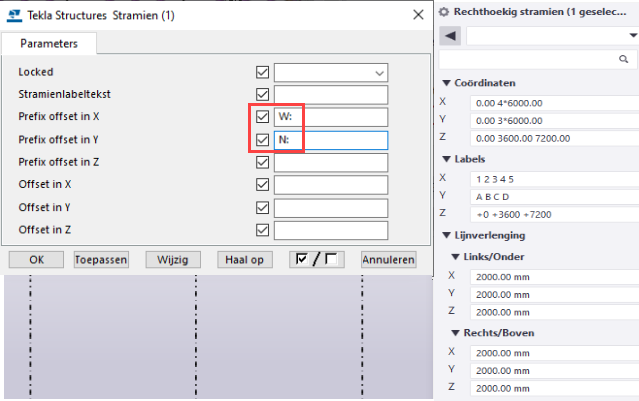 Voordat u stramienlabels kunt aanpassen, moet u de door de gebruiker gedefinieerde stramieneigenschappen in het model en ook andere stramieneigenschappen wijzigen, afhankelijk van uw wensen. U kunt er ook voor kiezen om de prefixtekst in de tekening te wijzigen.