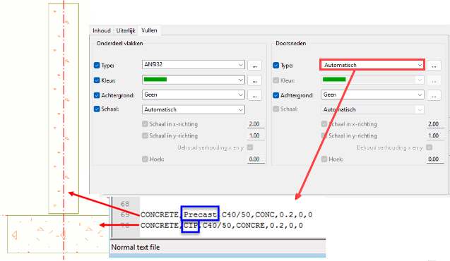 Insitu- en prefab-arceringen gebruiken verschillende automatische arceringen afhankelijk van het type betonelement. U moet het juiste type betonelement in de eigenschappen van het betonnen onderdeel selecteren.