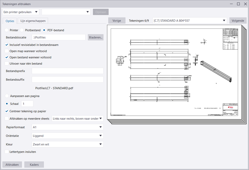 U kunt tekeningen als PDF-bestanden afdrukken, deze als plotbestanden (.plt) opslaan voor het afdrukken met een printer/plotter of deze op een geselecteerde printer afdrukken. Tekla Structures biedt een realtime voorbeeld van tekeningen in het dialoogvenster Tekeningen afdrukken. U kunt ook de uitvoerkleuren en lijndiktes wijzigen.