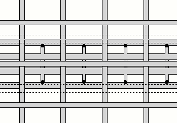 Verberg lijnen achter andere wapeningsstaven is geselecteerd. De wapeningsstaaflijnen zijn achter andere wapeningsstaaflijnen verborgen. De verborgen staaflijnen worden in de afbeelding weergegeven als stippellijnen. |
