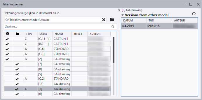 Het weergeven van tekeningversies is handig als u om de een of andere reden een oudere versie van de tekening wilt terugkeren. Versiecontrole is ook beschikbaar in Tekla Model Sharing en u kunt onbedoelde wijzigingen beheren die in tekeningen zijn aangebracht en naar de versie terugkeren die de juiste inhoud heeft.