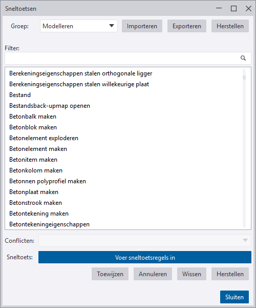 U kunt in het dialoogvenster Sneltoetsen een lijst bekijken met alle snelkoppelingen die beschikbaar zijn in Tekla Structures. U kunt nieuwe sneltoetsen definiëren en bestaande verwijderen. U kunt de sneltoetsen na aanpassing exporteren en deze delen met uw collega’s.