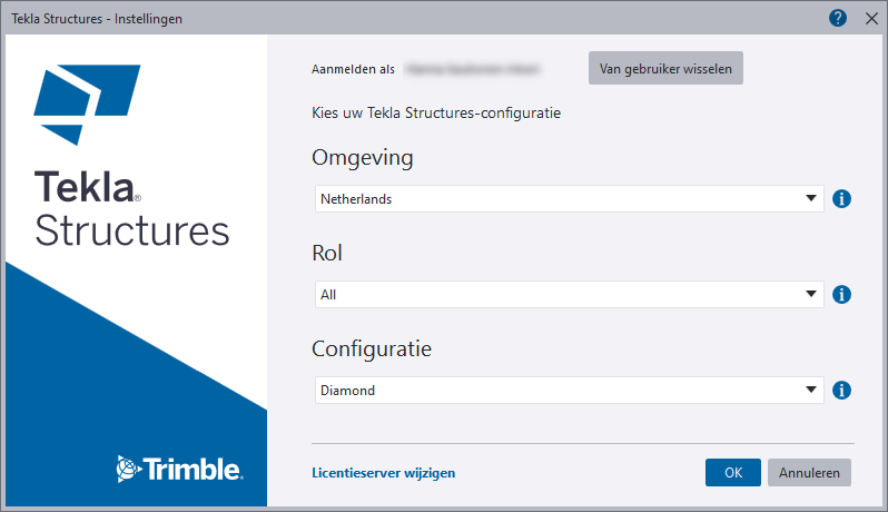 U kunt uw huidige Tekla Structures-installatie (omgeving, rol, configuratie en organisatie) op elk gewenst moment controleren, zonder dat u het model hoeft te sluiten.