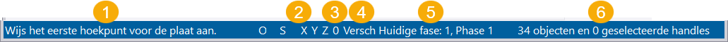 De statusbalk is het gebied dat zich bevindt aan de onderzijde van het hoofdvenster van Tekla Structures. Volg de instructies in de statusbalk als u commando´s gebruikt. Wanneer u een onderdeel maakt, informeert de statusbalk bijvoorbeeld u hoe u moet doorgaan en wanneer u punten moet aanwijzen.