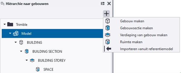 De commando's voor het maken van alle gebouwhiërarchie-elementen staan in hetzelfde menu in het zijvenster Hiërarchie naar gebouwen. Klik op de knop