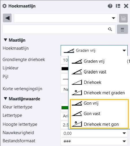 Er zijn nieuwe opties voor gon beschikbaar in het eigenschapsvenster Hoekmaatlijn, de miniwerkbalk, de maatlijneigenschappen van overzichttekeningen en in de oude dialoogvensters voor maatlijneigenschappen: