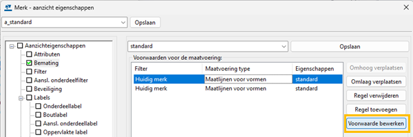 Wanneer u met de knop Regel toevoegen nieuwe regels toevoegt aan een voorwaarde in gedetailleerde objectinstellingen en u een voorwaarde hebt geselecteerd, wordt de nieuwe regel nu ingevoegd na de geselecteerde regel. Vroeger werd de nieuwe voorwaarde altijd toegevoegd als laatste in de voorwaardeset en moest u de regel verplaatsen naar de gewenste positie in de voorwaardeset met de knoppen Omhoog verplaatsen en Omlaag verplaatsen.