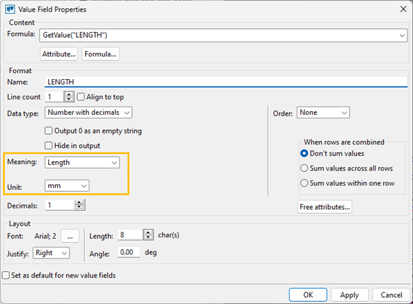 - Definieer in de Template Editor zowel Betekenis als Eenheid voor waardevelden, als u geen standaardeenheid wilt gebruiken voor de betekenis. Vroeger was de eenheid niet altijd correct. In sommige gevallen werd voor de Lengte bijvoorbeeld meters gebruikt als standaardeenheid.