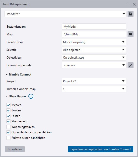 U kunt nu rechtstreeks een TrimBIM-bestand (.trb) maken in Tekla Structures en selecteren welke IFC-eigenschappensets in het TrimBIM-bestand worden opgenomen.
