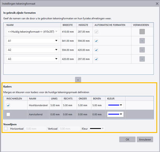 bij het definiëren van tekeningkaders en vouwlabelkleuren in Opmaakeditor van de tekening