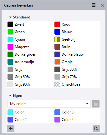 In de modus voor kleurenpaletselectie kunt u een standaard- of aangepaste kleur selecteren om te gebruiken, en in de modus voor kleurenpaletbewerking kunt u een set aangepaste kleuren definiëren en opslaan in een eigenschappenbestand, zodat u deze bijvoorbeeld gemakkelijk kunt hergebruiken en delen in een specifiek project. Kleureigenschappenbestanden kunnen in alle standaardbestandslocaties zoals project- of bedrijfsmappen worden geplaatst en gebruikt. De opgeslagen aangepaste kleurenpaletten zijn beschikbaar op alle plaatsen waar u de kleuren mogelijk wilt wijzigen: Voor alle tekeningobjecten op alle tekeningeigenschapsniveaus, voor lijneigenschappen bij het afdrukken en voor template-objecten in de Template Editor.