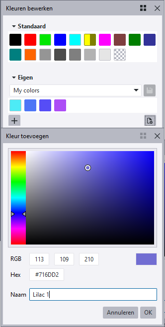 Nieuwe aangepaste kleur toevoegen . - Het dialoogvenster Kleur toevoegen wordt geopend. Ga met de kleurschuifregelaar aan de linkerkant naar de gewenste kleur en kies vervolgens met de kleuraanwijzer de gewenste tint in het kleurgebied.