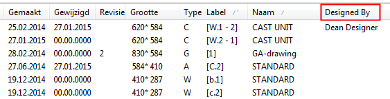 De Documentmanager bevat een kolom voor het nieuwe gebruikersattribuut en de naam van de ontwerper wordt weergegeven.