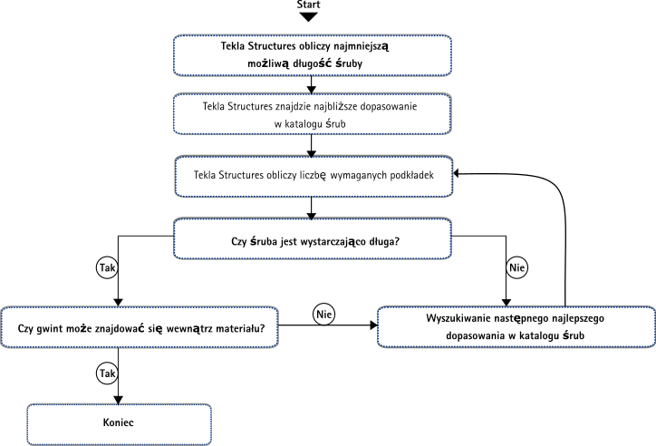 Jeśli wybrana śruba nie spełnia wszystkich powyższych warunków, Tekla Structures wraca do kroku 2 i próbuje wykorzystać następną najdłuższą śrubę.
