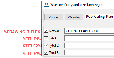 W przypadku wprowadzania atrybutów użytkownika lub atrybutów szablonu umieść wokół nich pojedyncze znaki % w oknie dialogowym Opcje zaawansowane. Atrybut %DRAWING_TITLE% jest wartością domyślną, a atrybut %TITLE% daje taki sam wynik. Jeśli używasz tych atrybutów, do etykiety widoku jest dodawana nazwa rysunku wprowadzona w polu Nazwa w oknie dialogowym właściwości rysunku. W przypadku wprowadzania atrybutu %TITLE1%, %TITLE2% lub %TITLE3% do etykiety widoku jest dodawany tekst z pól Tytuł 1 - Tytuł 3 we właściwościach rysunku. Ten sam efekt można również uzyskać za pomocą formatów %DR_TITLE1%, %DR_TITLE2% i %DR_TITLE3%.