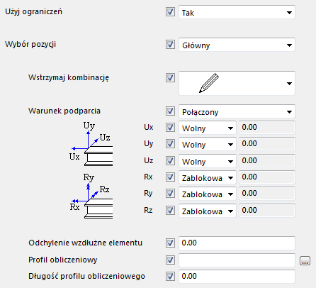 | Użyj ograniczeń obliczeń | Ustaw na Tak, aby w połączeniu używać właściwości obliczeń połączenia lub detalu w obliczeniach zamiast właściwości obliczeń elementów.