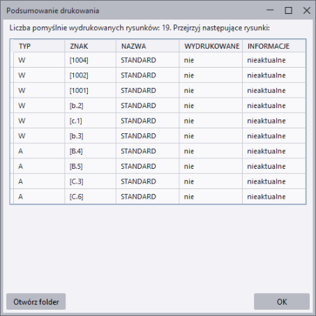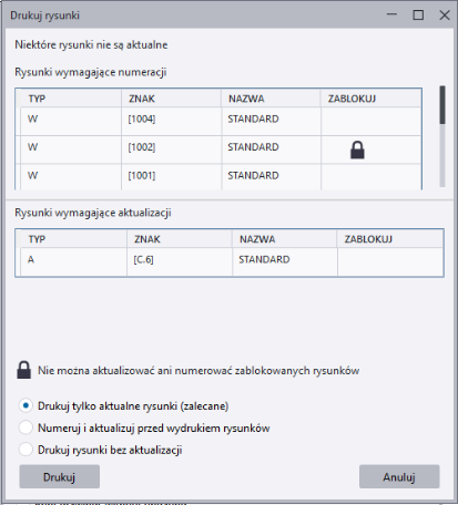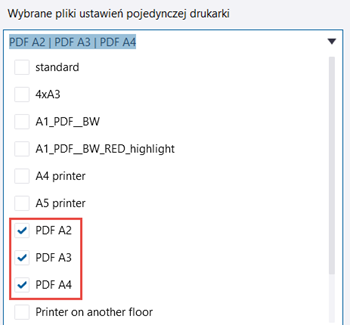 Podczas drukowania zestawu rysunków w trybie wielu drukarek przy użyciu powyższych plików ustawień drukarki dla wszystkich rysunków A4 będą generowane pliki .pdf z przedrostkiem A4_, dla wszystkich rysunków A3 pliki będą miały przedrostek A3_, a dla całego rysunku A2 zostaną wygenerowane pliki .pdf z przedrostkiem A2_.