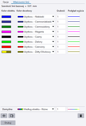 Aby na wydruku używany był tylko jeden kolor i jedna grubość linii dla wszystkich obiektów, należy zdefiniować żądany kolor i grubość linii dla wiersza Domyślna i usunąć wszystkie wiersze właściwości linii. W przypadku wybrania opcji Według obiektu kolory obiektów rysunku używane na wydruku będą takie same jak na rysunku. |