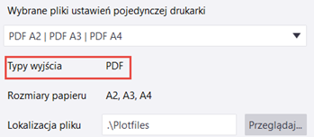 Wprowadź lokalizację pliku PDF lub pliku wydruku lub użyj pola Przeglądaj..., aby przejść do folderu. Domyślną lokalizację jest folder \Plotfiles znajdujący się w folderze modelu. Ta opcja jest dostępna tylko po wybraniu Plik PDF lub Plotuj plik. |