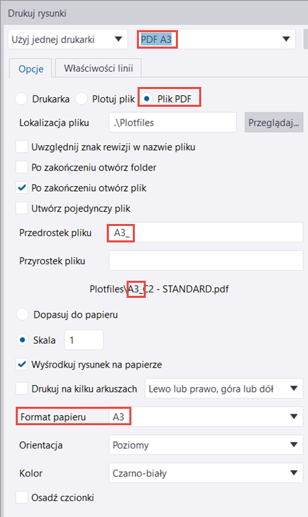 - PDF A3: Rozmiar papieru ustawiony jako A3, przedrostek pliku ustawiony jako A3_