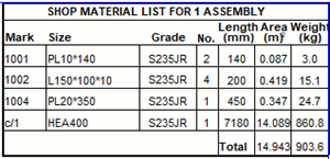(8) Tabela listy materiałów z wierszem nagłówka tabeli, wierszami zawartości tabeli, wierszem całkowitego ciężaru zbrojenia i wierszem całkowitego ciężaru zespołu betonowego