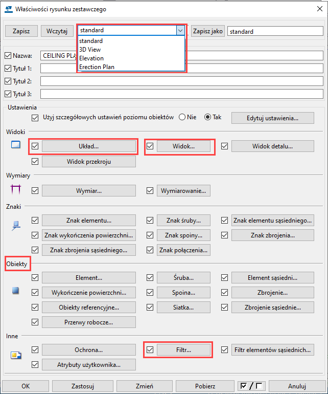 Obiekty rysunku są zorganizowane w obrębie widoków rysunku, które są umieszczane w wybranym układzie rysunku zgodnie z wybranymi ustawieniami: