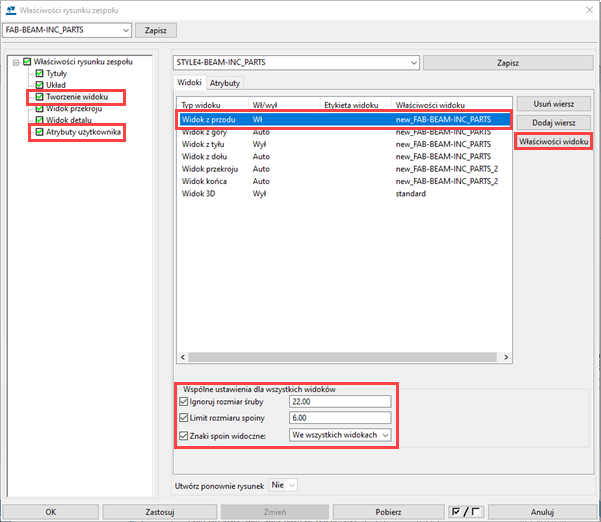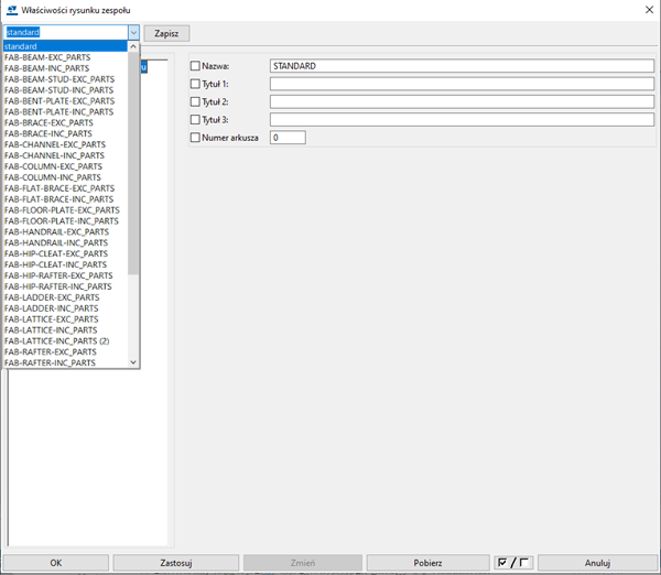 Ponieważ jest to pierwszy projekt, zalecamy utworzenie rysunku produkcyjnego elementów stalowych przy użyciu predefiniowanych ustawień ze środowiska, a następnie ręczne zmodyfikowanie rysunku w trybie rysunku zgodnie z potrzebami. Poniższe instrukcje odnoszą się do rysunków zespołów.